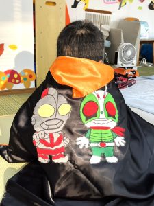 ヒーローのマントで登場~どう、かっこいいでしょう!
