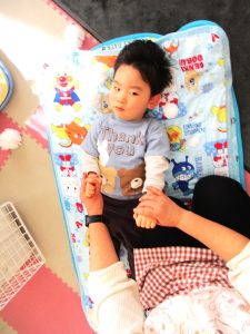 頭から手、足、お腹と、体全身をお歌に合わせて優しく触れていきます。