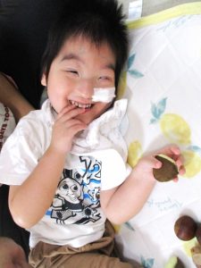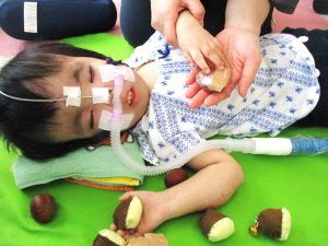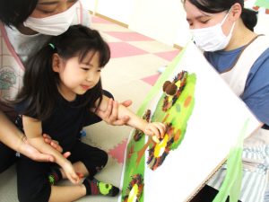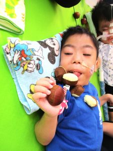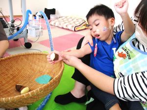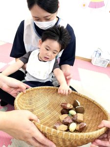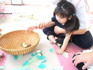 前回のぶどう狩りあそびと同様に、フェルトやビニールなど色々な素材で作った栗や本物の栗に触れてみました!